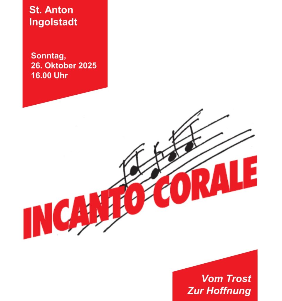 Unter der Leitung von Manfred Faig und gemeinsam mit Johanna Schumertl (Sopran), Carl Rumstadt (Bass) und Deborah Faul (Orgel) gestaltet Incanto Corale am Sonntag, 26. Oktober, ein Konzert unter dem Titel „Vom Trost zur Hoffnung“. Es beginnt um 16 Uhr in der Kirche St. Anton (Münchener Straße 40, 85051 Ingolstadt). Auf dem Programm stehen das… Konzert am 26. Oktober weiterlesen